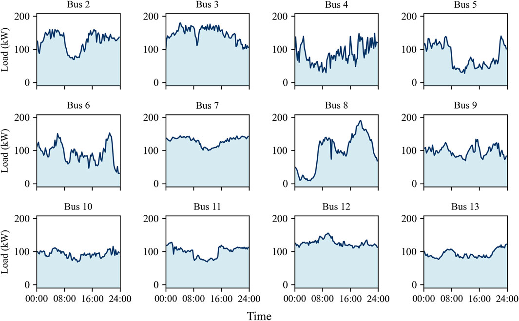 Load data from a specific 12-bus low-voltage distribution network in Southwest China are used as the load input for buses 2–13 in the above system. The typical daily load curves for each bus are shown in Figure 5. The figure shows that the selected loads include the impact loads and low-fluctuation loads.