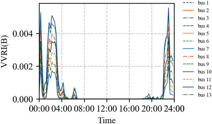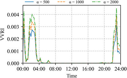 According to Formulas 16, 17, the curves of the VVRI(B) for each bus over time are obtained, as shown in Figure 7. To evaluate the impact of the aggregation factor α on the aggregated voltage violation risk indicator in Formula 18, the VVRI is computed and compared for different values of α (500, 1,000, and 2,000), as shown in Figure 8.