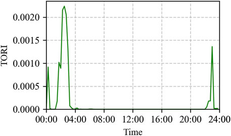 According to Formulas 19, 20, the variation curve of the TORI value at each time-point is obtained, as shown in Figure 9. The TORI indicator shows that the overload risk mainly occurs during the 01:30–03:00 period, with significant risk peaks also appearing at 00:15 and 23:00. This distribution pattern results from multiple bus loads simultaneously reaching their peaks during the night. Such concurrent peak demand causes the transformer’s short-term load rate to rise sharply and significantly increases the probability of overload. The constructed TORI indicator integrates both overload severity and its occurrence probability. It accurately reflects the operational risk of the transformer under extreme load fluctuations, demonstrating strong early warning capability and clear physical interpretability.