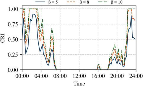 2. When β = 8, the CRI reaches 1 during 01:30–03:00 and 22:30–23:00, exceeding the extreme risk threshold. The low-risk periods show higher CRI values (approximately 0.3), with more pronounced variations.