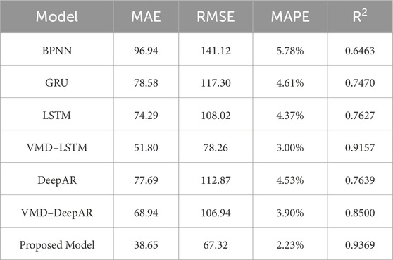 The mean value of the model output is used as the point forecast of the load. The mean absolute error (MAE), root mean square error (RMSE), mean absolute percentage error (MAPE), and the coefficient of determination (R2) are selected as evaluation metrics. To validate the effectiveness of the proposed model, its forecasting results are compared with those of typical forecasting models (BPNN, GRU, LSTM, and VMD–LSTM) and the original DeepAR and VMD–DeepAR models. These typical models are configured with two hidden layers and 128 neurons per layer. They are followed by two fully connected layers with 256 and 128 neurons, respectively, and use the Huber loss function. Other settings are consistent with the proposed model. The point forecast evaluation results are shown in Table 2.