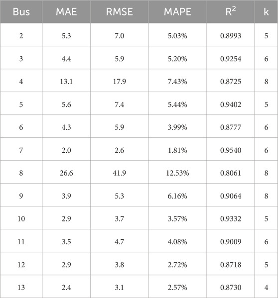 The forecasting accuracy evaluation results for each bus load are shown in Table 3. The table shows that 50% of the bus load forecasts achieve accuracy above 95%, demonstrating the prediction accuracy and reliability of the proposed model.