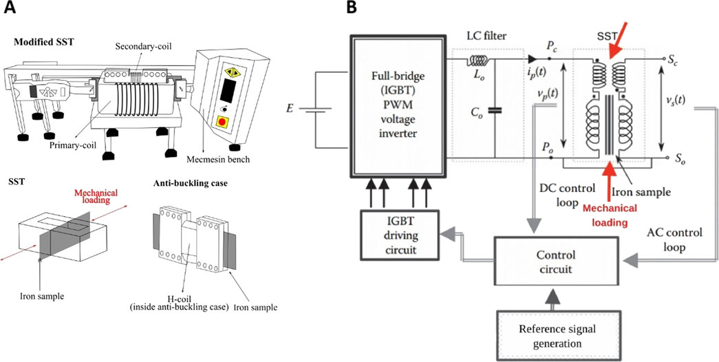 The primary instrument for data acquisition is the custom-built magneto-mechanical test bench, a modified Single Sheet Tester (SST) designed to apply uniaxial stresses parallel to the magnetic flux direction. This specialized setup allows for the study of magnetic material behavior under tensile or compressive mechanical stresses. Figure 1 illustrates the system: Figure 1A) shows a view of the test bench and the modified SST, highlighting the mechanical application components. Figure 1B presents the functional diagram of the system, detailing the control circuit, the power excitation components, and the measurement loops.