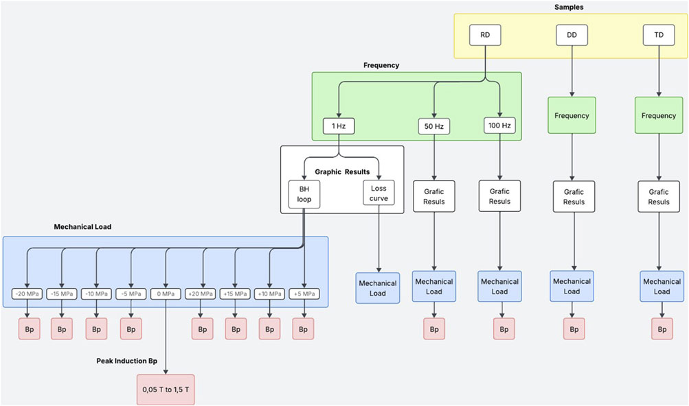 This structure was designed to facilitate the visualization and analysis of magnetic characteristics, such as BH loops and magnetic loss curves. Each box in the diagram corresponds to a subfolder, with the lowest level containing individual data files in CSV format.