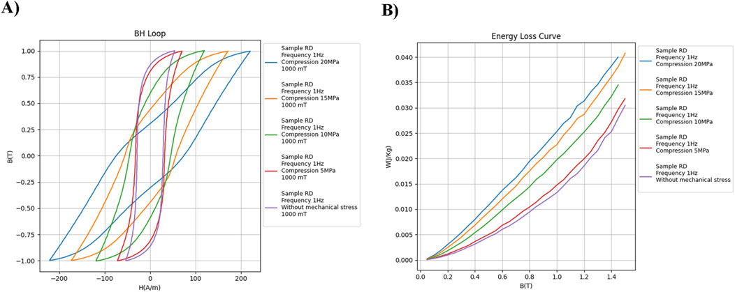 This structure enables multifactorial analysis of magnetic behavior as a function of sample orientation, mechanical stress, and excitation frequency. A Python-based script is included in the dataset to automate the visualization of BH loops and loss curves. The user can select input parameters (sample orientation, frequency, and stress level) and generate corresponding plots. Figure 3A illustrates a representative BH loop obtained for the RD sample at the four compressive level applied and the no-stress condition, 1 Hz and 1,000 mT, while Figure 3B shows the variation of hysteresis loss (losses at 1 Hz) with increasing peak induction for the RD sample for the same stress condition presented in Figure 3A. This visualization demonstrates the strong impact of compressive stresses, evidencing intense modifications in the BH loops and, consequently, in magnetic losses, due to the sharp decrease in magnetic permeability. The curves, presented in red, green, orange, and blue, illustrate the changes caused by the compression levels of