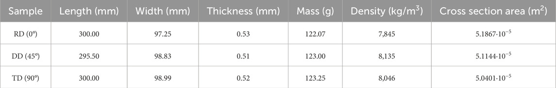 The samples consist of NOG iron-silicon (Fe-Si) electrical steel sheets cut in three different directions relative to the rolling direction: 0° (RD), 45° (DD), and 90° (TD). The dimensions of the characterized samples are detailed in Table 1. Dimensional data were obtained by averaging at least three measurement sets.