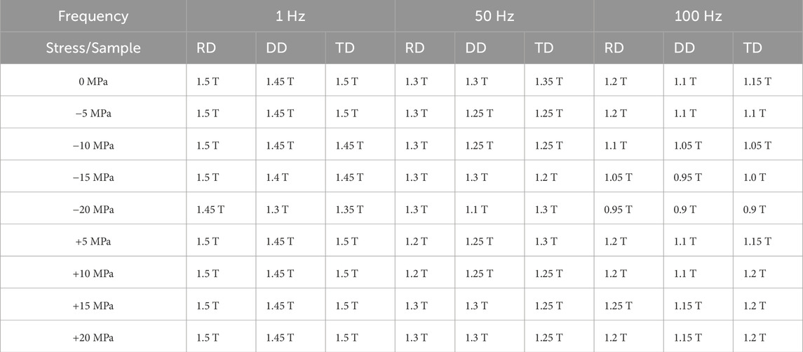 The ability to achieve higher peak magnetic induction levels was constrained by the limitations of the experimental setup. This restriction occurs primarily at high magnetic inductions and under compressive mechanical stress because the magneto-mechanical coupling effect significantly modifies the BH curves. This alteration leads to a considerable increase in the material’s dissipated magnetic losses, consequently demanding a higher current excitation from the test bench. Table 2 presents the maximum peak induction values achieved for each sample under different frequency and mechanical stress conditions.