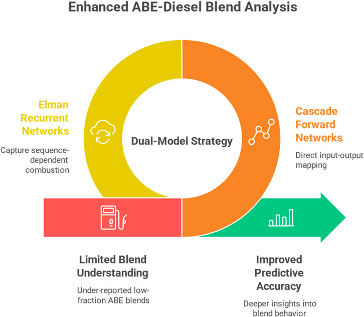 The novelty of this study can be summarized in two main contributions. First, it delivers a focused investigation of low-ratio ABE–diesel blends at 5% and 10% under fixed-speed operation with load variation, addressing an under-reported regime that is particularly relevant for generator sets and urban duty cycles. Second, it introduces a dual-model strategy that combines Cascade forward networks, which excel in direct input–output mapping, with Elman recurrent networks, which capture sequence-dependent combustion dynamics. This complementary use of neural architectures strengthens predictive accuracy and provides deeper insights into the nonlinear behavior of ABE–diesel blends. Figure 1 illustrates the contribution of the study.