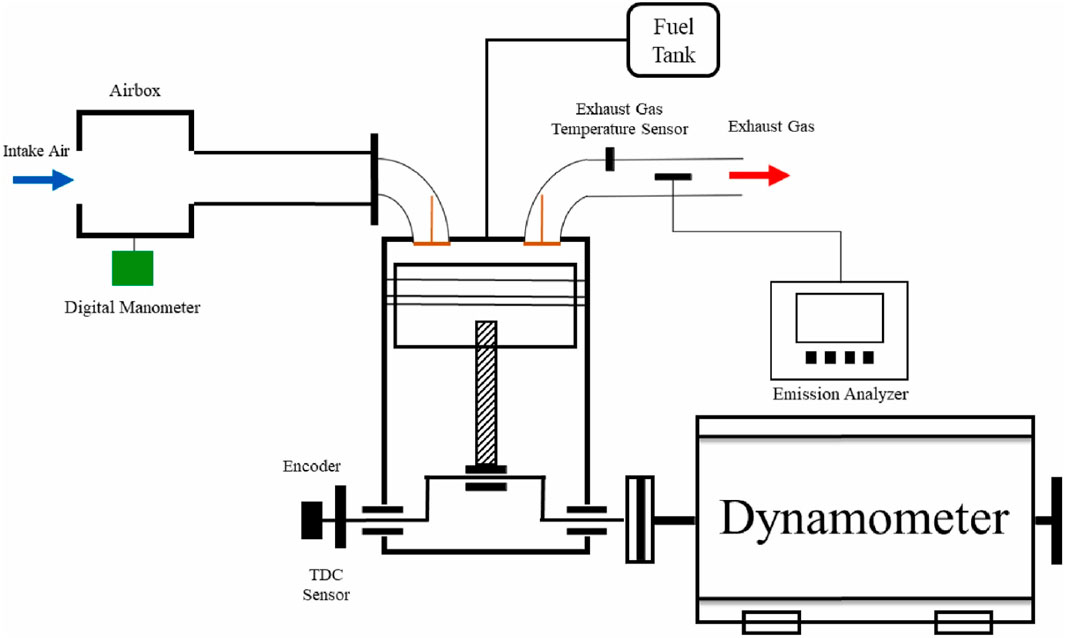 Figure 3 illustrates the experimental configuration employed for evaluating ABE–diesel blends in a compression ignition engine. The intake air enters through an airbox equipped with a digital manometer to measure pressure. Fuel from the fuel tank is injected into the cylinder, and combustion gases are released through the exhaust line, where an exhaust gas temperature sensor and an emission analyzer record CO, CO2, NOx, and HC. The engine shaft is connected to an eddy-current brake dynamometer that controls load and torque. A TDC sensor and encoder are installed to synchronize combustion measurements. This arrangement allowed systematic variation of engine load at a fixed speed of 1,200 rpm while monitoring performance, combustion, and emission characteristics.