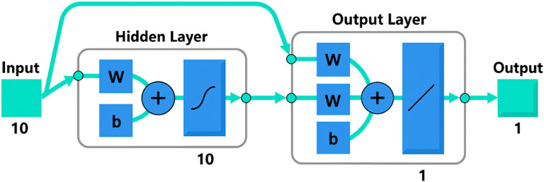 The Cascade ANN architecture consists of three layers: an input layer, a hidden layer, and an output layer. The input layer receives ten variables that represent the experimental parameters. These inputs are processed through a hidden layer containing ten neurons, where each neuron computes a weighted sum of the inputs (W), adds a bias term (b), and passes the result through an activation function (f) (Figure 4). The hidden layer output is then connected to the output layer, which contains a single neuron. The output neuron applies another weighted summation and activation process to generate the final prediction. Feedback connections are also incorporated to improve the learning process. This configuration enables the network to capture nonlinear relationships between input parameters and the output response.