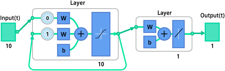 In Elman neural networks, the inputs are processed in the hidden layer containing 10 neurons, where each neuron performs a weighted summation of the inputs (W), adds a bias term (b), and applies a nonlinear activation function (Figure 5). The hidden layer also incorporates bias nodes (labeled 0 and 1) to improve flexibility in model fitting. The processed signals are then passed to the output layer, which contains a single neuron that generates the final predicted value. Feedback connections are integrated within the structure to enhance learning efficiency and stability. This architecture enables accurate mapping of nonlinear relationships between experimental parameters and the output response.