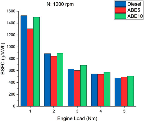 Figure 6 presents the Brake Specific Fuel Consumption or BSFC of diesel, ABE5, and ABE10 across engine loads from 1 to 5 Nm. BSFC quantifies the fuel required to generate a unit of brake power, serving as a direct metric of engine efficiency (Wang et al., 2021). BSFC is defined as the mass of fuel consumed per unit of brake power output, where a lower BSFC value indicates higher thermal efficiency. The results show a clear decreasing trend in BSFC with increasing load for all fuels. At 1 Nm, diesel recorded 1525.37 g/kWh, while ABE5 and ABE10 were lower at 1304.78 g/kWh (−14.5%) and 1498.51 g/kWh (−1.8%) respectively. At 2 Nm, ABE5 and ABE10 maintained lower BSFC values than diesel, with reductions of 4.8% and −1.1% respectively. At 3 Nm, ABE5 again reduced BSFC by 4.1% compared to diesel, while ABE10 was slightly higher (+10.3%). At 4 Nm, ABE5 was nearly identical to diesel (−0.8%), while ABE10 increased BSFC by 5.6%. At the highest load (5 Nm), both ABE5 and ABE10 showed higher BSFC than diesel, with increases of 3.4% and 6.5% respectively. Overall, ABE5 consistently delivered lower or comparable BSFC to diesel at low-to-medium loads, whereas ABE10 showed efficiency penalties at medium-to-high loads.