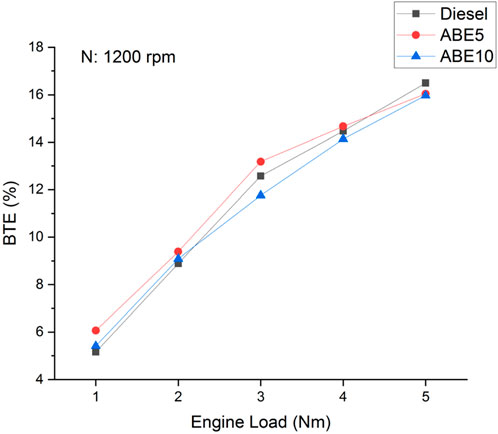 Figure 7 presents the Brake Thermal Efficiency or BTE of diesel, ABE5, and ABE10 blends at engine loads from 1 to 5 Nm. BTE reflects the proportion of chemical energy in the fuel converted into useful brake power (Sanjeevannavar et al., 2022), where higher values signify superior combustion efficiency and fuel utilization. BTE is defined as the ratio of brake power to the energy input from fuel, strongly influenced by fuel heating value, combustion characteristics, and oxygen content. The results reveal a steady increase in BTE with rising load for all tested fuels. At 1 Nm, diesel achieved 5.16%, while ABE5 and ABE10 recorded 6.06% (+17.5%) and 5.41% (+4.9%), respectively, highlighting efficiency benefits from ABE oxygenation at light load. At 2 Nm, ABE5 and ABE10 both surpassed diesel, showing 9.39% (+5.7%) and 9.09% (+2.3%) improvements. At 3 Nm, ABE5 again outperformed diesel at 13.18% versus 12.58% (+4.8%), whereas ABE10 lagged slightly at 11.76% (−6.5%). At 4 Nm, ABE5 marginally exceeded diesel with 14.67% vs. 14.47% (+1.4%), while ABE10 trailed slightly at 14.13% (−2.3%). At the highest load (5 Nm), diesel led with 16.50%, while ABE5 (16.04%) and ABE10 (15.98%) were marginally lower by −2.8% and −3.2%. Overall, ABE5 consistently enhanced BTE at light-to-medium loads (up to +17.5%), while both ABE blends converged with diesel at higher loads, suggesting a diminishing advantage as the calorific value deficit became more dominant.