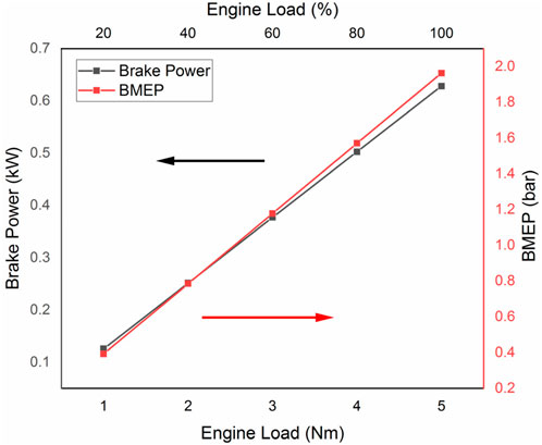 Figure 8 shows the variation of brake power (BP) and brake mean effective pressure (BMEP) across engine loads from 1 to 5 Nm. Brake power represents the actual output power delivered by the engine shaft, while BMEP is a normalized measure of engine load, independent of displacement, that reflects the mean pressure acting on the piston to generate brake work (Bhatt, 2025). Brake power is proportional to the product of torque and rotational speed, whereas BMEP provides a load-based performance metric that facilitates comparison between fuels and engines of different sizes. As expected, both BP and BMEP increased proportionally with engine load. BP rose from 0.1268 kW at 1 Nm to 0.6284 kW at 5 Nm, marking a fivefold increase (+400%), while BMEP increased from 0.3928 bar to 1.9638 bar (+400%). This linear progression reflects the direct correlation between torque and effective mean pressure within the cylinder. The results validate the reliability of the test engine setup and confirm that load increments translate consistently into higher shaft power and mean pressure, forming the baseline for evaluating BSFC and BTE trends under different fuel conditions. These values show the mechanical responsiveness of the test engine and provide essential reference points for interpreting subsequent combustion and efficiency parameters.