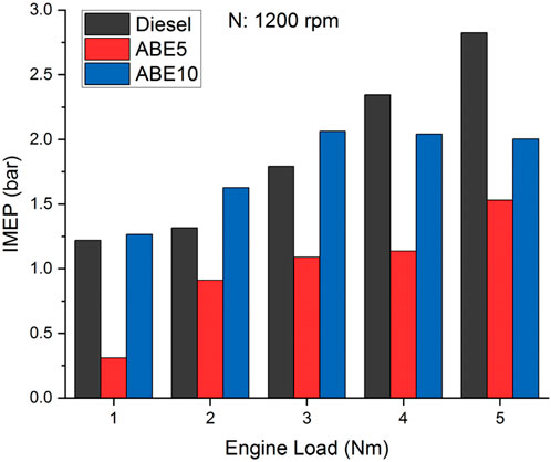 Figure 9 illustrates the variation of Indicated Mean Effective Pressure (IMEP) with engine load for diesel, ABE5, and ABE10 fuels. IMEP is a key thermodynamic parameter that quantifies the average pressure acting on the piston during the power stroke, directly reflecting the engine’s capacity to produce work per cycle (Greencorn et al., 2022). As engine load increased from 1 to 5 Nm, IMEP rose steadily across all fuels, highlighting the expected proportional relationship between torque demand and in-cylinder pressure development. Diesel recorded the highest IMEP values, increasing from 1.22 bar at 1 Nm to 2.82 bar at 5 Nm, while ABE5 showed the lowest increase (0.31–1.53 bar), and ABE10 maintained intermediate performance (1.27–2.00 bar). The lower IMEP of ABE5 (73%–80% lower than diesel across loads) and ABE10 (20%–30% lower than diesel) indicates reduced energy release efficiency, attributed to the oxygenated nature of ABE blends which lowers heating value. However, the smoother rise in IMEP for ABE10 compared to ABE5 suggests better combustion stability when a higher fraction of ABE is used. Please note that IMEP differences could arise from varying combustion characteristics and oxygen content of ABE blends rather than simple mechanical work differences. These findings imply that while ABE blends reduce absolute pressure output, they may contribute to more controlled combustion, potentially reducing emissions at partial loads.