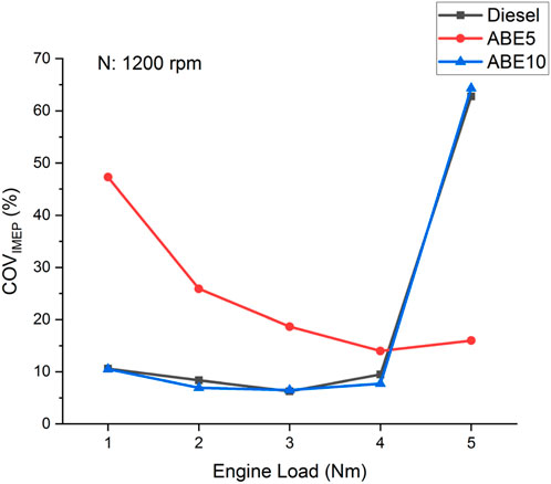 Figure 10 presents the coefficient of variation of indicated mean effective pressure (COVIMEP) as a function of engine load at 1,200 rpm for diesel and ABE blends. The COVIMEP, a key indicator of combustion cyclic stability (Batool et al., 2021), should remain below 10% for smooth engine operation. At low load (1 Nm), ABE5 exhibits a unstable combustion with COVIMEP of 47.3%, nearly 4.5 times higher than diesel (10.6%) and 3.5 times higher than ABE10 (10.5%), indicating severe cycle-to-cycle fluctuations due to poor ignition quality under lean conditions. As load increases, COVIMEP for ABE5 decreases substantially to 15.9% at 5 Nm, a 66% reduction compared to its value at 1 Nm, although still higher than diesel (6.3%). In contrast, ABE10 maintains relatively stable operation between 1 and 4 Nm (6.9%–10.5%) but shows a sharp increase to 64.4% at 5 Nm.