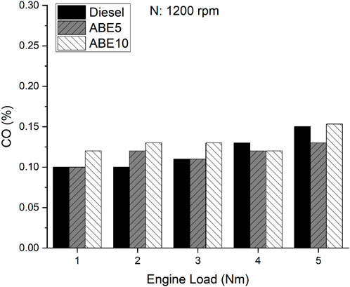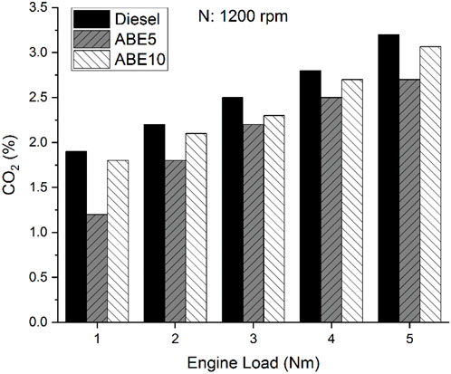 Figure 12 shows CO2 emissions versus engine load for diesel, ABE5, and ABE10. CO2 is the final product of complete combustion (Ditl and Šulc, 2024), with higher concentrations generally reflecting more efficient oxidation of carbon in the fuel. CO2 formation is directly proportional to the degree of combustion completeness, influenced by oxygen availability, fuel carbon content, and combustion temperature. CO2 emissions increased with load for all fuels, from 1.9% (diesel), 1.2% (ABE5), and 1.8% (ABE10) at 1 Nm to 3.2%, 2.7%, and 3.07% respectively at 5 Nm. Across all loads, ABE5 consistently showed lower CO2 than diesel, with reductions of 36.8% at 1 Nm, 18.2% at 2 Nm, and 15.6% at 5 Nm. ABE10 closely followed diesel, with small differences: −5.3% at 1 Nm, −4.0% at 2 Nm, and −4.0% at 3 Nm, but converging at high load (only −4.2% at 5 Nm). These results indicate that ABE5 reduces carbon intensity, while ABE10 maintains CO2 values close to diesel due to its higher blend ratio. The findings suggest that low-level ABE blending (5%) can reduce CO2 emissions significantly, supporting climate mitigation targets without penalizing engine efficiency. Meanwhile, ABE10’s near-equivalent CO2 levels highlight its viability as a partial diesel replacement fuel, although its carbon savings are less pronounced.
