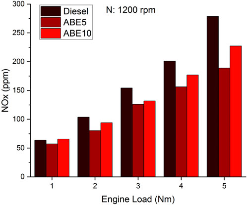 The CO2 results indicate that ABE5 reduces carbon intensity, while ABE10 maintains values close to diesel due to its higher blend ratio. This behavior can be explained by the combined effects of fuel chemistry and combustion characteristics. ABE5 contains sufficient oxygen to promote more complete oxidation of carbon within the combustion chamber, leading to lower CO2 formation per unit of energy released. In addition, its relatively higher cetane index compared to ABE10 ensures shorter ignition delay and more efficient combustion phasing, which minimizes unburned carbon and improves overall efficiency. In contrast, ABE10, despite containing more oxygen, possesses a lower heating value and a significantly lower cetane index. These properties can cause delayed ignition and incomplete oxidation under certain load conditions, offsetting the benefit of its higher oxygen content (Veza et al., 2019). As a result, CO2 emissions from ABE10 become nearly close to diesel. This shows a balance between enhanced oxygenation and reduced combustion efficiency.