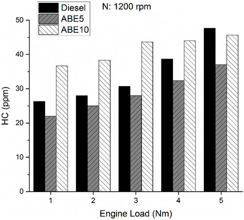 Figure 14 presents hydrocarbon (HC) emissions versus load for diesel, ABE5, and ABE10. HC is a product of incomplete combustion, typically arising from poor fuel–air mixing, quenching near chamber walls, or short combustion duration (Iodice and Cardone, 2021). HC emissions decrease with more complete combustion, and oxygenated fuels such as ABE blends can reduce HC formation by promoting oxidation of unburned hydrocarbons. HC emissions rose with engine load for all fuels. At 1 Nm, diesel emitted 26 ppm, while ABE5 was lower at 22 ppm (−16.5%), and ABE10 was higher at 37 ppm (+39%). At 3 Nm, diesel produced 31 ppm, ABE5 reduced this to 28 ppm (−9.4%), whereas ABE10 rose to 44 ppm (+42%). At 5 Nm, diesel reached 48 ppm, ABE5 reduced emissions to 37 ppm (−22.4%), while ABE10 remained close at 46 ppm (−4.2%). Overall, ABE5 consistently reduced HC across loads, with the largest reduction at full load (−22%), whereas ABE10 generally showed higher or comparable values due to incomplete combustion linked to its lower volatility and higher butanol fraction. This shows that ABE5 enhances combustion quality, reducing HC emissions across all load conditions. In contrast, ABE10 exhibited unstable combustion, with higher HC at light-to-medium loads, indicating blending ratio is critical for optimizing emissions. These results suggest that small ABE additions are more beneficial for hydrocarbon reduction than higher blends.