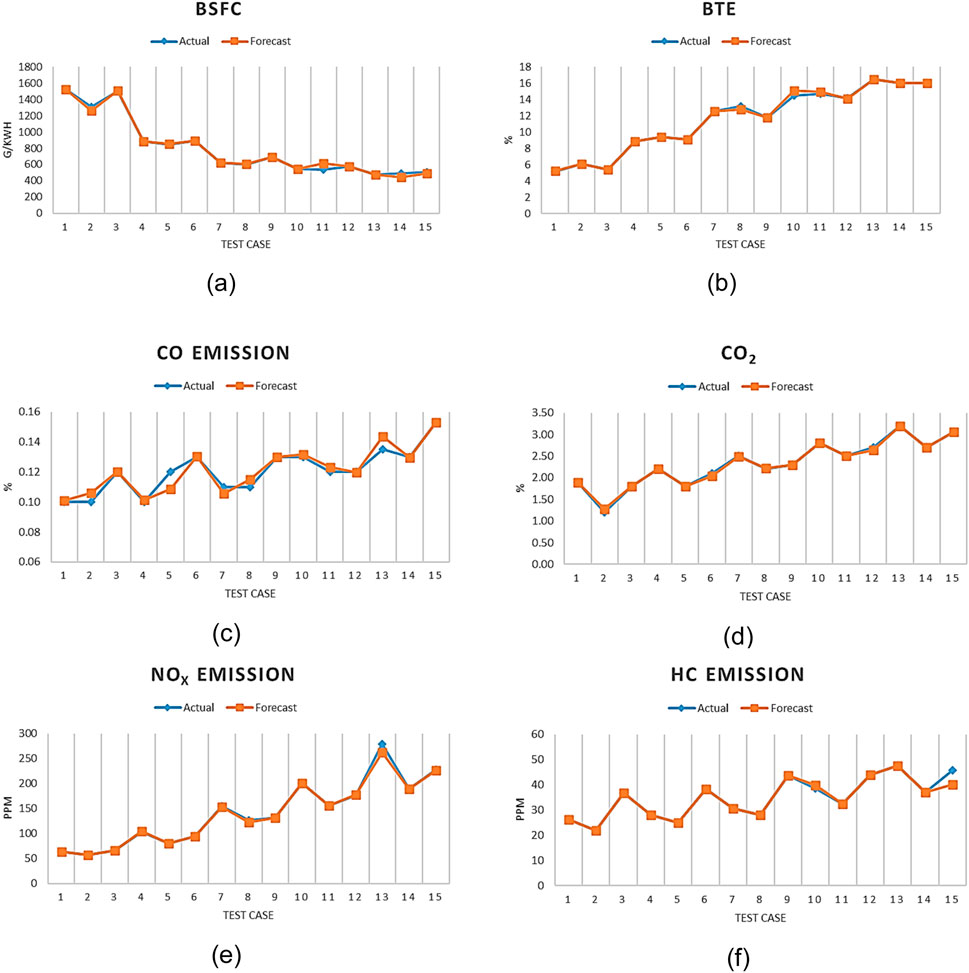 Figure 16. Comparison of actual and forecast (a) BSFC, (b) BTE, (c) CO, (d) CO2, (e) NOx and (f) HC emission across the test cases for Cascade neural networks.