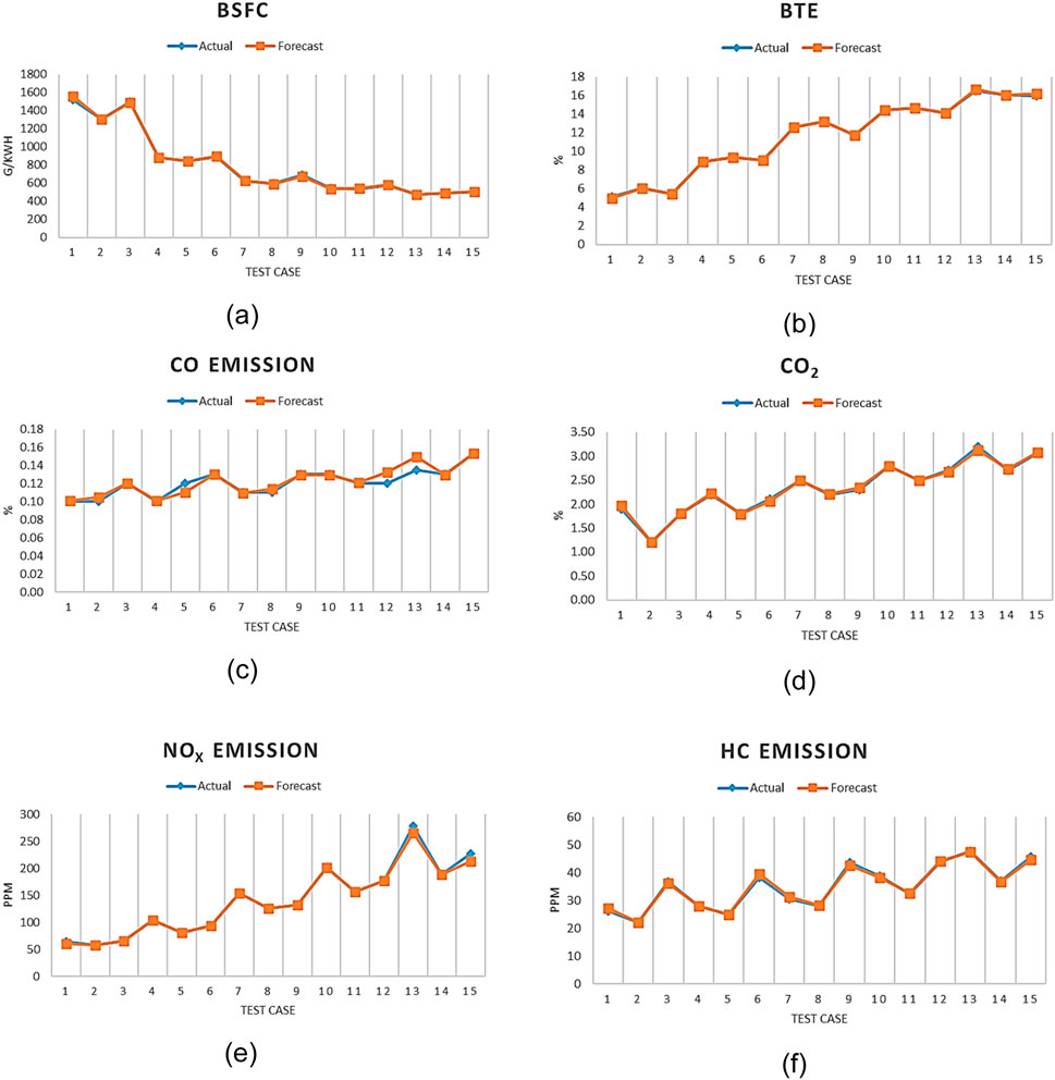 Figure 15. Comparison of actual and forecast (a) BSFC, (b) BTE, (c) CO, (d) CO2, (e) NOx and (f) HC emission across the test cases for Elman neural networks.