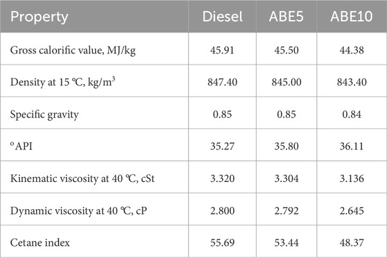 Table 1. Fuel properties of diesel and ABE blends (5% and 10% by volume) (Veza et al., 2021a; Veza et al., 2024).