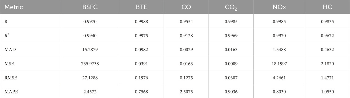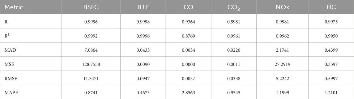 The performance metrics of the Elman ANN model for predicting engine performance and emissions are summarized in Table 2. The results demonstrate predictive capability across all parameters, with correlation coefficients (R) exceeding 0.95 for CO, HC, and other variables, and approaching unity for BSFC, BTE, CO2, and NOx. The coefficient of determination (R2) values confirm this high accuracy, particularly for BTE (0.9975), CO2 (0.9969), and NOx (0.9970). The error indicators, including MAD, MSE, RMSE, and MAPE, remain consistently low, with CO (MAD = 0.0029, MAPE = 2.51%) and CO2 (MAD = 0.0163, MAPE = 0.90%) showing especially precise predictions. Although slightly higher errors are observed for NOx and HC compared to other outputs, their performance remains within acceptable predictive limits. These results validate the application of the Elman ANN in capturing the nonlinear behavior of combustion and emissions, thus establishing it as a reliable tool for modeling engine performance with oxygenated fuels.