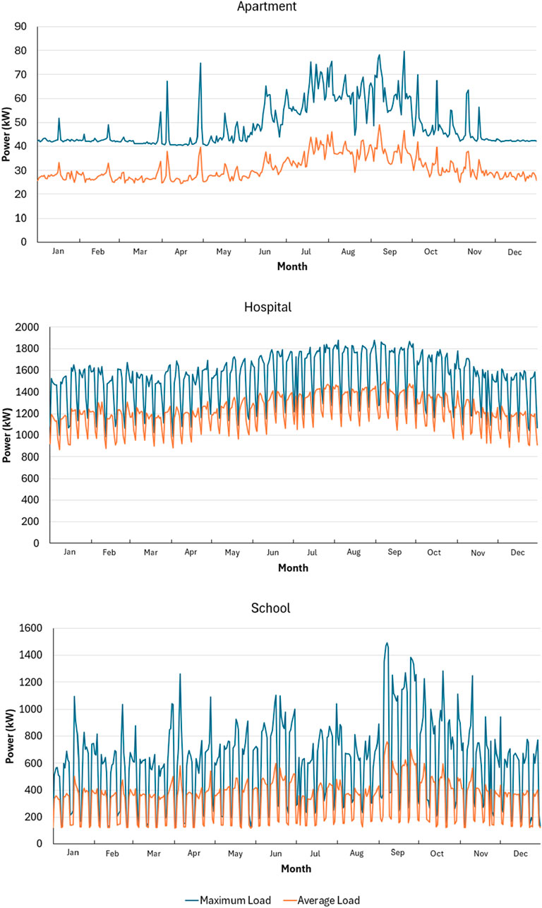 Figure 1. Annual load profiles for case study building types showing maximum and average load with daily resolution.