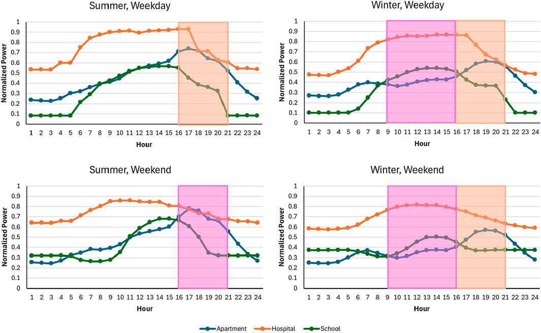 Load profile generation is completed using EnergyPlus. EnergyPlus is a whole building energy simulation program that models energy consumption—for heating, cooling, ventilation, lighting, and plug and process loads—and water use in buildings (U.S. Department of Energy, 2023). Typical load profiles were taken of buildings adhering to Los Angeles area building codes for construction after 1980 and input into EnergyPlus to generate annual energy consumption profiles with a 1-h time step resolution in the Los Angeles climate. Summary statistics of these load profiles are given in Table 2, showing significant differences in the overall amount of energy use and load factor. These differences can also be visualized in Figure 1 that shows daily maximum demand and average demand over a 1-year period. Figure 2 explores this further by providing an intraday time series graph of average hourly load by season and by day type normalized to the peak annual demand. This helps confirm visually that the hospital has a higher load factor and has a load shape that is fairly consistent throughout the year, whereas the apartment and school show greater variation during a week and across seasons in the year.