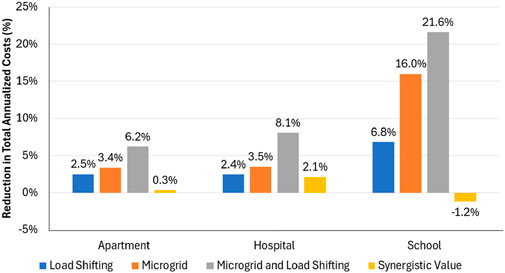 Figure 3 displays the change in total annualized costs for all scenarios relative to the base case, with results shown for load shifting, a microgrid, a microgrid and load shifting (stacked value), and the synergistic value. The synergistic value is equated using Equation 3 and described here as an example for the apartment: