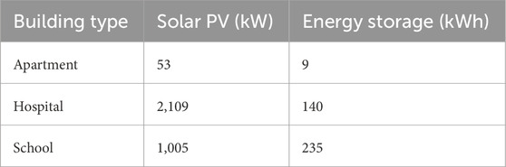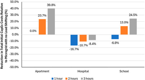 Results in Figure 3 are shown for load shifting of up to 2 h and 15% of total load shifted. Load shifting provides stacked value in reducing annualized costs for the apartment, hospital, and school of 6.2%, 8.1%, and 21.6%, respectively. The synergistic value is 0.3%, 2.1%, and −1.2%, respectively. Since the tariff structure is the same in all cases, the variation in the amount saved is attributed to the optimal microgrid asset sizing and load control to deliver least cost power for each building type. Results for the apartment and hospital show similar improvements with load shifting and microgrids separately. But it is interesting to note that the stacked value and the synergistic value are greater for the hospital than for the apartment. This is because hospital loads could be shifted out of the peak TOU into a low TOU period or to midday when there is ample solar PV production, thereby permitting significant reductions in energy storage size and the associated capital cost, as indicated in Figures 4, 5. When looking at the school, the increased benefits obtained by load control or microgrids is attributed to (a) the load shape peak tends to coincide with periods of greater solar PV production, and (b) the low load factor that allows a smaller amount of load to be shifted to reduce demand charges in a significant way. Yet combining both load control and microgrids created a negative synergistic value, which occurs because the microgrid and load shifting affect the load shape in the same way for the school, thereby leaving no opportunity for synergistic reductions in energy costs.