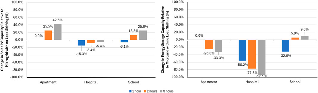 More of the underlying details to the behaviors in Figure 3 can be observed when examining how microgrid asset sizing changes when load shifting is not included (Table 6) and contrasting this to how sizing is affected when including increasing amounts of load shifting (Figures 4, 5). Figures 4, 5 show that only the hospital consistently has fewer capital assets installed (both solar PV and energy storage) when load shifting is added, the apartment installs more solar PV but less energy storage, and the school installs more solar PV and more energy storage (except under the 1 h load shift duration). This trend parallels the rank ordering of the synergistic value created, with hospital as the greatest, then the apartment, and lastly the school (which has a negative value). Further, this trend matches the rank order of load factors from Table 2 and suggests that load factor could be used as a proxy with synergistic value in some cases.