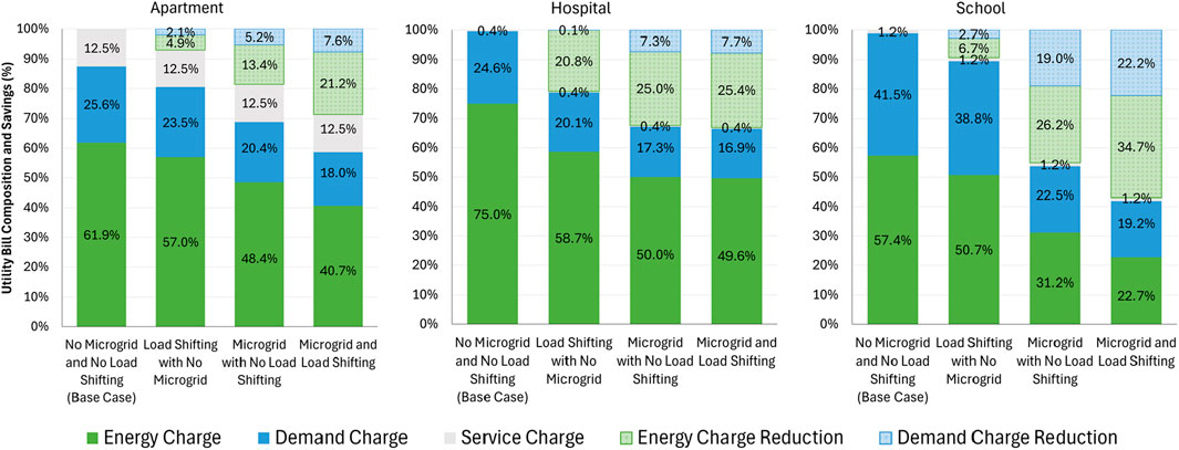 Changes in annualized costs under each scenario are further described by reductions in utility expenditure components as shown in Figure 6. Most of the financial benefits occur from energy charge reductions that result in 50%–300% greater savings than demand charge reductions, with relative differences attributed to the rate structure and load profiles. When compared to the base case, energy charge reductions improve by an additional 57.5%, 1.6%, and 32.5% for the apartment, hospital, and school, respectively, when load shifting is added to the microgrid. This compares to demand charges being reduced by an additional 47.3%, 5.1%, and 17.4%, respectively, when load shifting is added to the microgrid. The results seem to suggest that the apartment and school may have the most synergistic value, but the opposite is the case, which can be seen in Figure 3, and is explained by comparing the results in Figure 6 with the results in Figures 4, 5. For the hospital, utility bill savings are essentially the same for the cases with a microgrid alone and a microgrid with load shifting, but the key difference is that load shifting permits a lower investment in capital expenditures to reach cost optimal results as suggested earlier. The school has the greatest reduction in utility expenditures than in any location, and this is obtained through significant reductions in both energy changes and demand charges relative to the other building types. The greater reduction in demand charges for the school can be attributed to the school's low load factor.