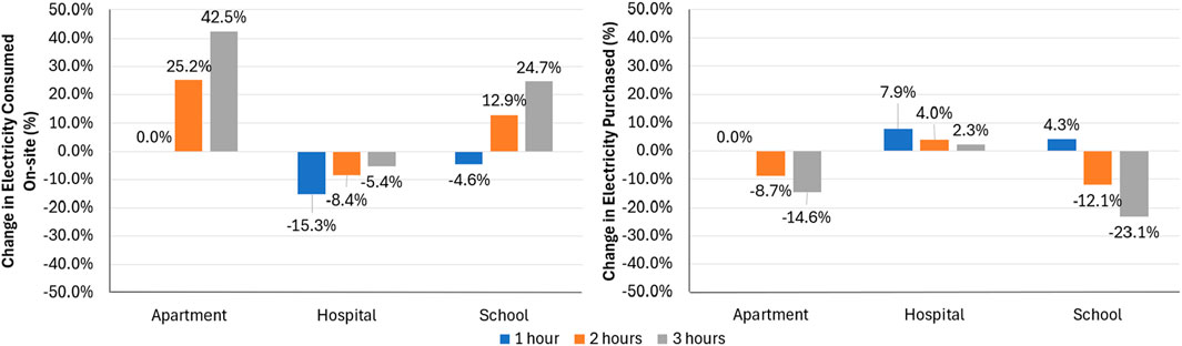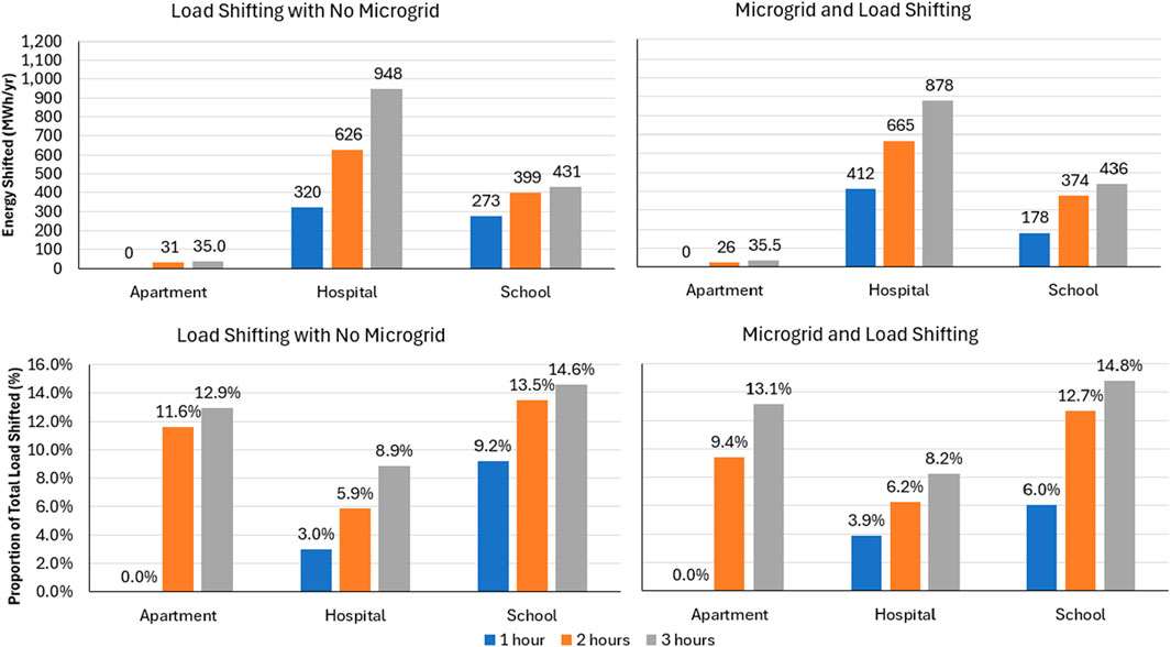 Comparing findings for the proportion of total load shifted in Figure 7 against the change in energy used from on-site resources and the grid from Figure 8 reveals greater nuances that underpin annualized cost savings. Specifically, the hospital uses less energy from on-site resources and purchases more energy from the grid when load shifting is added to the microgrid. This occurs because the hospital load shape can be adjusted to maintain demand charge and energy charge savings (Figure 6) with a reduced microgrid asset capacity (Figure 5) by shifting even small amounts of load into lower TOU periods that may not coincide with solar PV production (e.g., late evenings after peak TOU). While one may expect that shifting loads into periods with solar PV generation to be the most economical option, as with the apartment and school, the results from the hospital indicate this commonly held viewpoint may not yield the most financially beneficial result in all cases, a finding which further motivates the rationale for this study and the approach generally. Results in Figure 8 also show that, as load shifting duration increases, energy use from the grid and on-site resources tends to converge back to the microgrid only case for the hospital, but diverges for the apartment and the school, showing that load shifting for those two cases prioritizes using power from on-site solar PV and energy storage (Figure 5) for cost-optimal results.