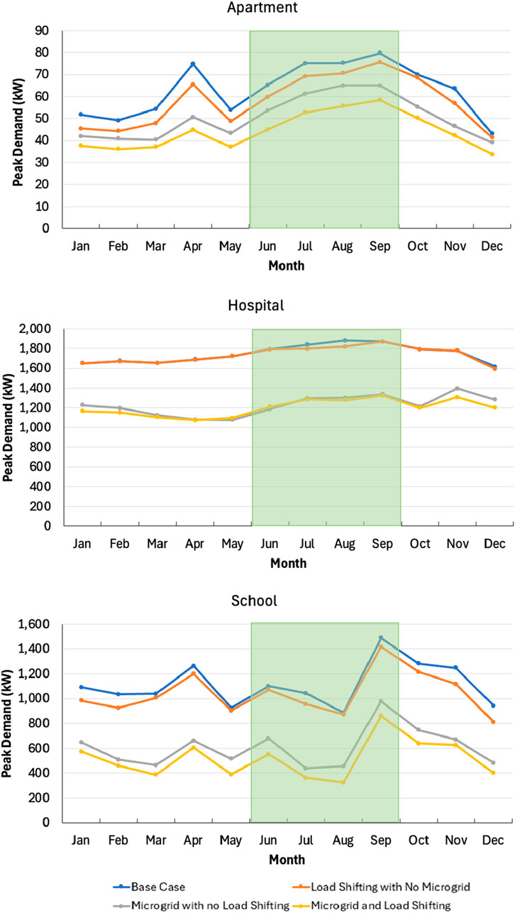 Figure 9 displays the peak demand in each month of the year across all building types and scenarios. Load shifting contributes minimally to demand reductions without the inclusion of a microgrid. Across the year, load shifting results in average peak demand reductions of 8.3%, 0.6% and 6.5% for the apartment, hospital, and school, respectively, whereas the microgrid with no load shifting results in reductions of 19.8%, 29.7%, and 46.2%, respectively, and the microgrid and load shifting provides reductions of 29.4%, 31.3%, and 54.5%, respectively. When looking at the hospital, results from Figures 6, 9 indicate that addition of a microgrid focuses on demand charge reductions whereas load shifting emphasizes energy charge reductions, thereby promoting more synergistic value when combined because the two approaches address different parts of the utility bill for that load profile. The school has the greatest reductions in demand, which is due to the relatively high “peakiness” of that load profile as evidenced by the load factors in Table 2.