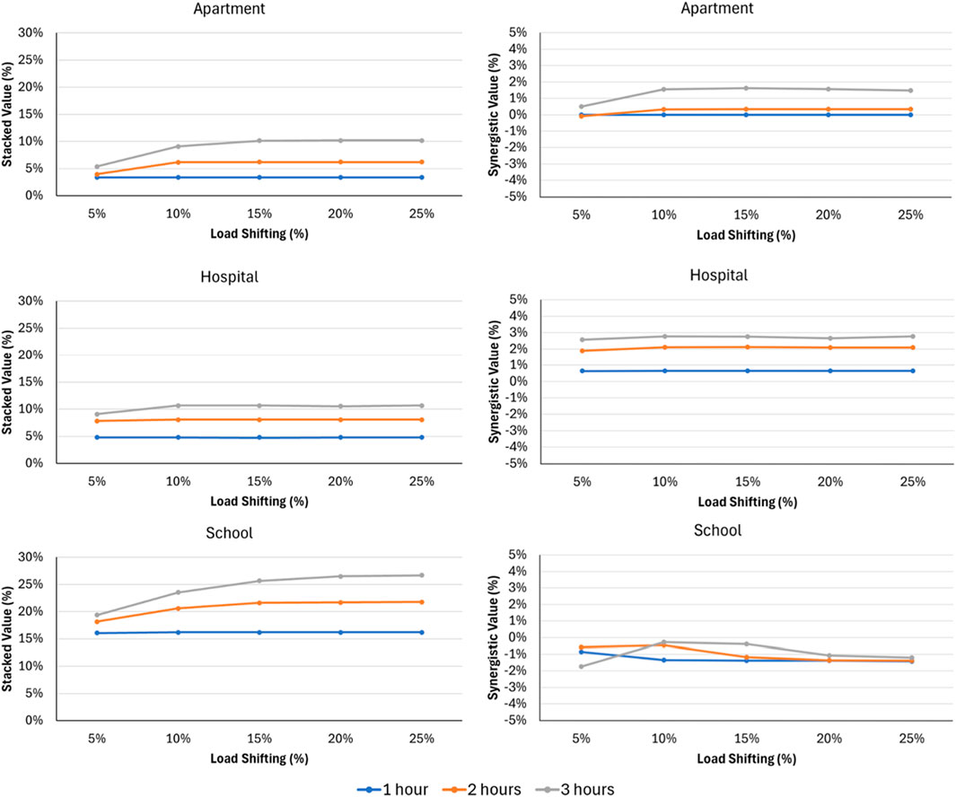 Most of the financial benefits occur from energy charge reductions that result in 50%–300% greater savings than demand charge reductions. When compared to the base case, energy charge reductions improve by an additional 57.5%, 1.6%, and 32.5% for the apartment, hospital, and school, respectively, when load shifting is added to the microgrid. This compares to demand charges being reduced by an additional 47.3%, 5.1%, and 17.4%, respectively. Across all building types, the proportion of total load shifted is inversely correlated with the synergistic value. The school receives greater stacked values than the apartment or hospital because of its high loads during times of greatest solar PV production and low load factor. Although the stacked value for the school is high, the synergistic value is low compared to the other building types. As load shifting percentage increases, the synergistic value for the school trends negative while the synergistic value for the hospital is flat and for the apartment trends positive at lower percentages of load shifting before flattening out. This underscores data showing that the stacked value and the synergistic value are primarily affected by the load shifting duration rather than the percentage of load shifting.