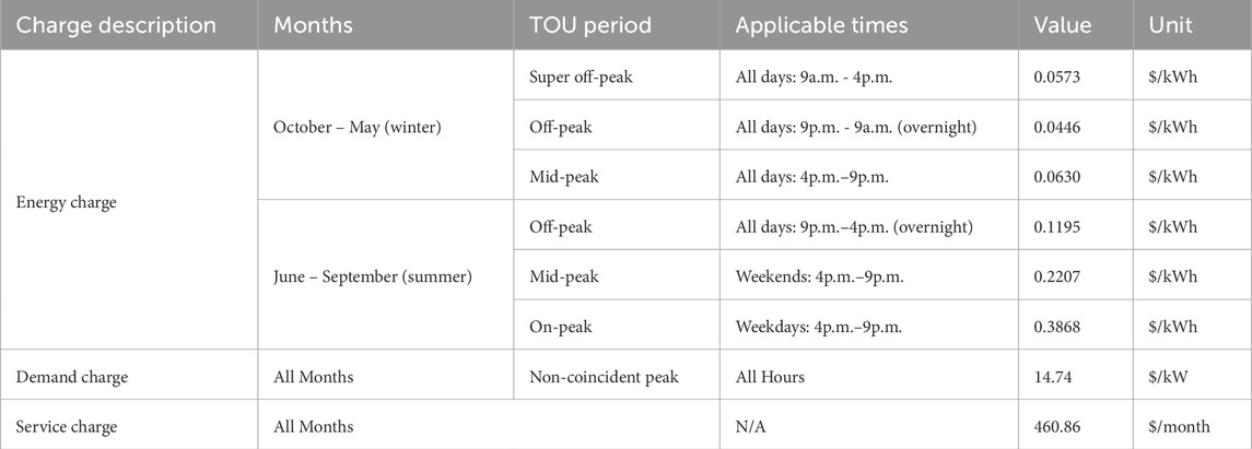 Southern California Edison (SCE) is the electric utility that serves the Los Angeles area. All three building types match the load requirements for the TOU-8 Option E rate structure for customers who participate in Permanent Load Shifting (PLS), which is defined as moving electrical energy usage from SCE's on-peak period to another time period on an ongoing permanent basis. Table 3 summarizes this tariff structure (SCE, 2023). Although net metering is allowed, it is not modeled in this work because of the recent changes made by the California Public Utilities Commission from NEM 2.0 to NEM 3.0 to decrease the value consumers receive when selling excess energy back to the grid (California Public Utilities Commission, 2025). This type of change or “roll-back” in net metering policies is actively being debated and modified by regulators across the United States (Trela and Dubel, 2021) (Gustafsson, 2017). In 2024 alone, 47 United States states and the District of Columbia implemented changes to net metering policy (Apadula, 2025). Therefore, this work does not model net metering to instead explore the value that microgrid assets and load shifting can offer for consumers in the increasingly common scenario where the utility provides less or no compensation under net metering.