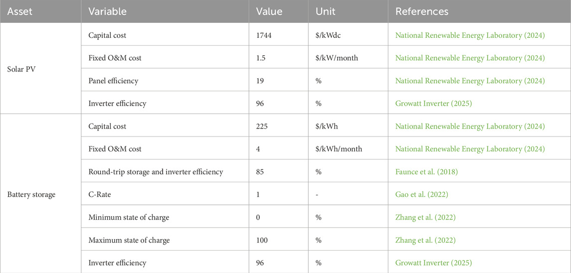 Table 4 summarizes inputs for microgrid assets. Asset costs were retrieved from a database of renewable energy technology costs for United States consumers across various classes and sizes (National Renewable Energy Laboratory, 2024). Technical data were taken from asset-specific specifications sheets when not available from (National Renewable Energy Laboratory, 2024). Capital costs and operating and maintenance (O&M) costs for inverters are embedded within the costs of solar PV and battery storage.