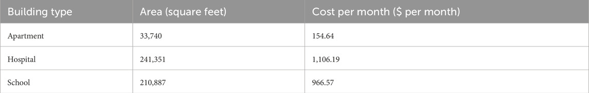 Load control costs are modeled in Xendee on a cost per month basis. This cost is calculated from a reference cost for a supervisory controller and load control at an estimated cost between $0.55 - $1.1 per square, or an average cost of $0.825 per sq ft (Katipamula et al., 2024). Taking an example for illustration, a reference building of 10,000 sq ft would require $8,250 in load control, and translating that value to a time basis requires an assumed project length such as 15 years to calculate the Xendee input of $42 per month. A similar calculation is completed for the building types with results given in Table 5.