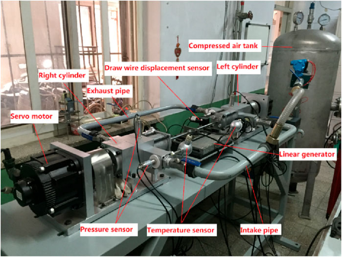 A detailed description of the FPE-LG test rig is available in Xu et al. (2018a), only a brief overview is provided here for context. The integrated FPE-LG system comprises five key subsystems: the free-piston expander, a tubular permanent magnet linear generator (PMLG), an electronically controlled valve train, a servo motor actuator, and a sensor suite for real-time monitoring. The FPA, consisting of the piston and the PMLG mover connected via a rigid rod, moves freely within the cylinder and stator, enabling direct mechanical-to-electrical energy conversion. The intake and exhaust valves are independently controlled by a servo motor, allowing flexible timing adjustment to match variable operating conditions. Key system parameters are summarized in Table 1, and the experimental setup is illustrated in Figure 1. The primary electrical and geometrical specifications of the PMLG are listed in Table 2.