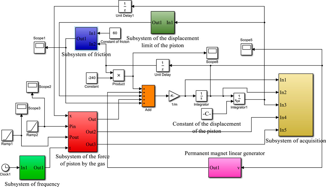 A dynamic simulation model of the FPE-LG system is developed in MATLAB/Simulink based on the first law of thermodynamics and coupled electromechanical principles. The model integrates thermodynamic processes within the expansion chamber, mechanical dynamics of the FPA, and electromagnetic generation characteristics, enabling a comprehensive analysis of system behavior under variable operating conditions. A detailed description of the modeling methodology, assumptions, and sub-model formulations can be found in Xu et al. (2018b). The overall simulation framework is illustrated in Figure 2.