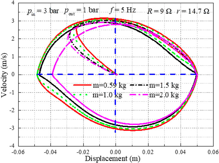 Figure 3 illustrates the velocity–displacement profiles of the FPA under varying FPA masses. As expected, the velocity reaches its maximum near the midpoint of the stroke and drops to zero at the operational top dead center and bottom dead center, consistent with typical reciprocating motion dynamics. A reduction in FPA mass results in increased peak velocity and stroke amplitude, indicating enhanced dynamic responsiveness. To minimize inertial forces and overall moving mass, the FPA is fabricated from a high-strength aluminum alloy. Under the specified operating conditions—intake pressure of 3 bar, operating frequency of 5 Hz, external load resistance of 9 Ω, FPA mass of 0.59 kg, and LG internal resistance of 14.7 Ω—the maximum FPA velocity reaches 3.12 m/s.