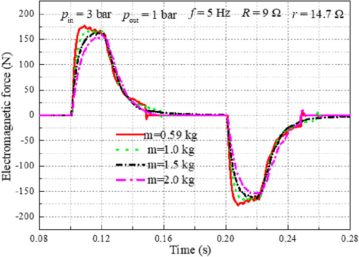 The electromagnetic force varies with the mass of the FPA as shown in Figure 4. It is observed that the electromagnetic force shows a downward trend when the mass of the FPA decreases. According to the Ref. (Jia et al., 2016), the electromagnetic force can be written as Equation 1: