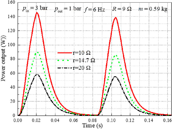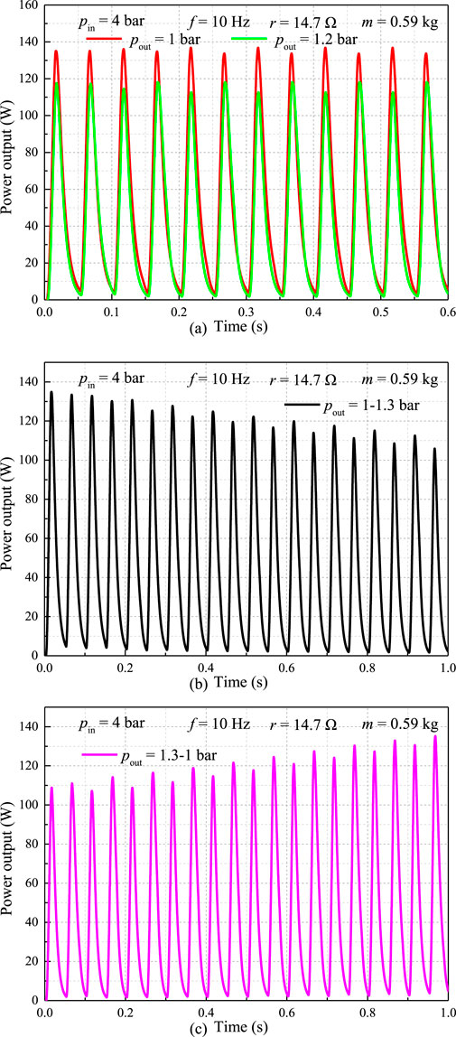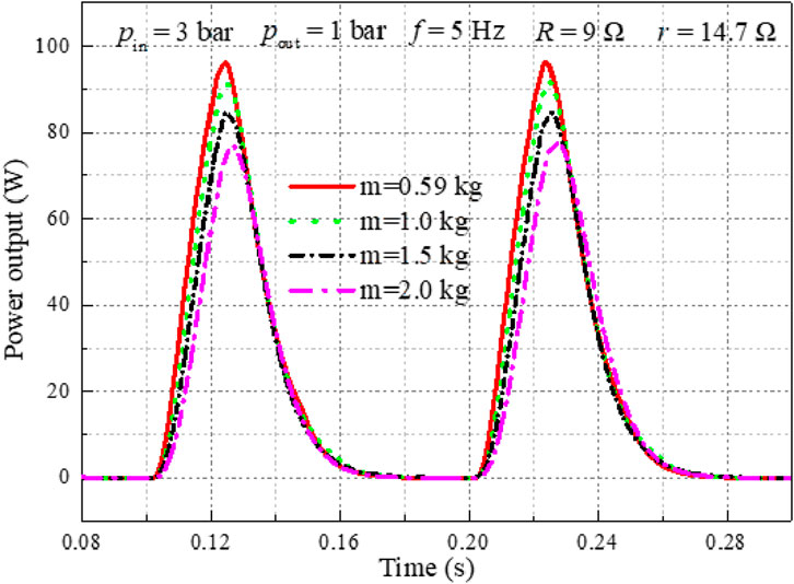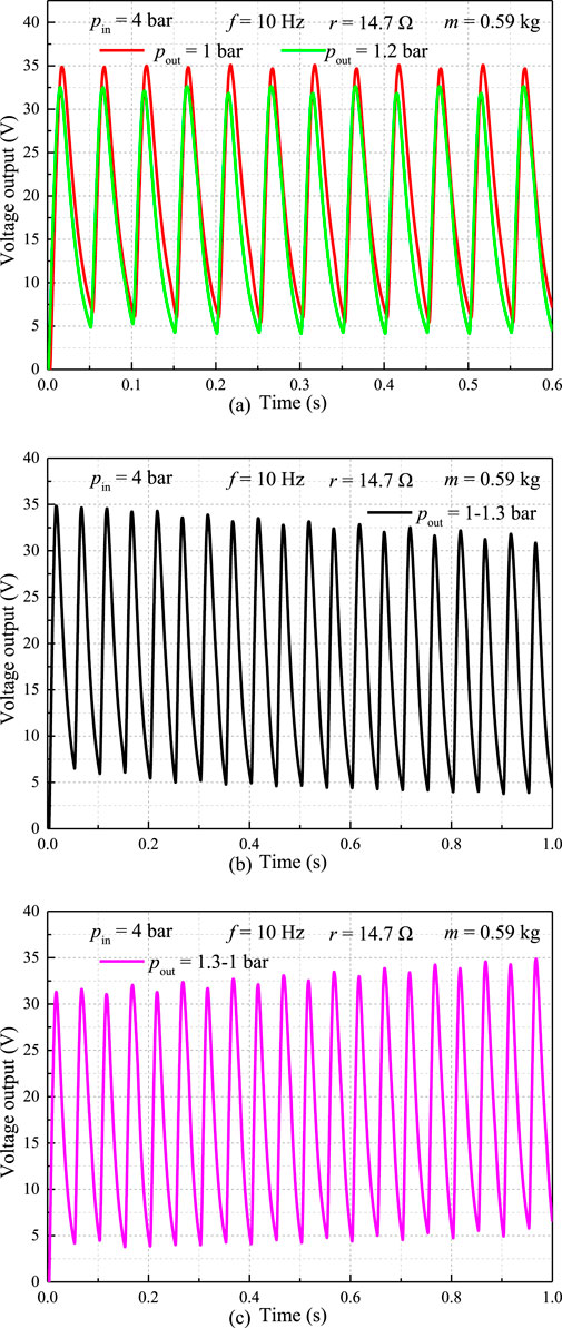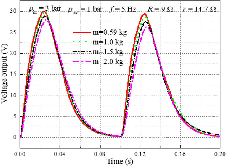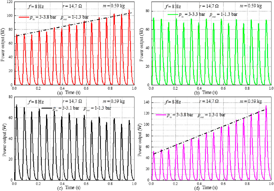 where Pout is the power output, U is the effective value of the voltage across the external load resistance. The voltage output and the power output reach the maximum of 30.0 V and 96.0 W when the intake pressure, operation frequency, external load resistance, mass of the FPA, and the internal resistance of LG are 3 bar, 5 Hz, 9 Ω, 0.59 kg and 14.7 Ω, respectively.