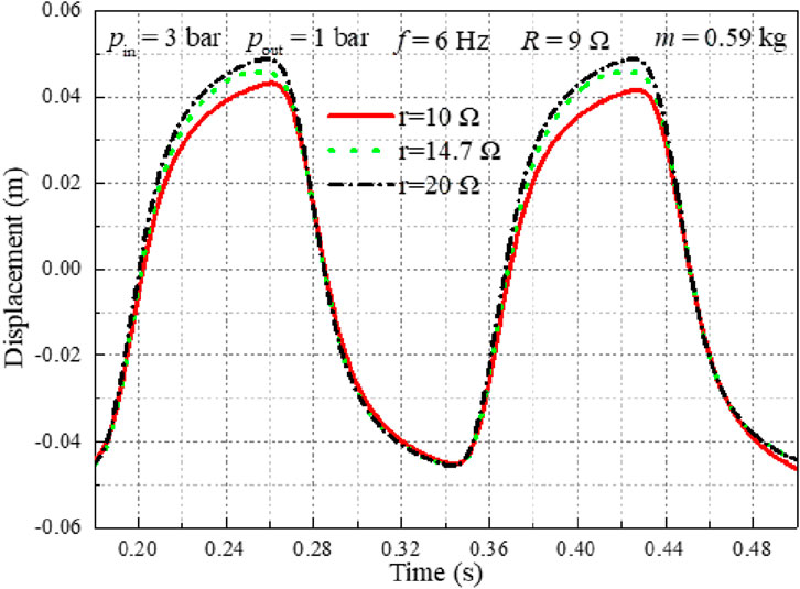 The dynamic performance of the FPE-LG system is significantly influenced by the characteristics of the LG, particularly its internal resistance. The increase in external load resistance reduces the electromagnetic damping force of the generator, allowing the piston to obtain greater acceleration under the same gas pressure drive, thereby moving to a farther position. As shown in Figure 7, increasing the LG’s internal resistance results in an increase in piston displacement. This behavior can be attributed to the reduced electromagnetic damping effect at higher internal resistance, which diminishes the electrical load on the moving FPA and allows for greater stroke amplitude. Under the following operating conditions—intake pressure of 3 bar, operating frequency of 6 Hz, external load resistance of 9 Ω, FPA mass of 0.59 kg, and LG internal resistance of 20 Ω—the maximum displacement of 0.095 m is achieved.
