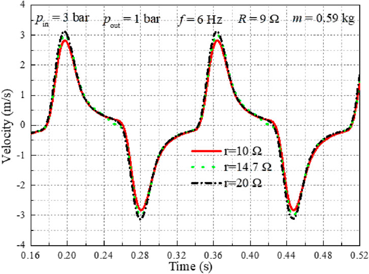 Figure 8 illustrates the influence of the internal resistance of LG on the velocity of the FPA. Consistent with the displacement trend observed in Figure 7, the peak piston velocity increases with rising internal resistance. This behavior is attributed to the reduction in electromagnetic force as the internal resistance increases, which weakens the electromagnetic damping effect and allows the FPA to achieve higher acceleration and velocity. Specifically, when the LG internal resistance is increased from 10 Ω to 20 Ω, the peak velocity rises from 2.7 m/s to 3.1 m/s under the specified operating conditions.