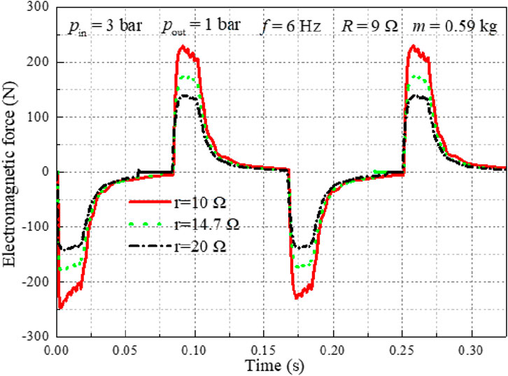 where Kf is the electromagnetic thrust force constant, Kv is the back electromotive force constant, R is the external load resistance, Ls is the inductance of LG, and r is the internal resistance of LG. So, the electromagnetic force and the velocity exhibit the same trend when varies the mass of the FPA.