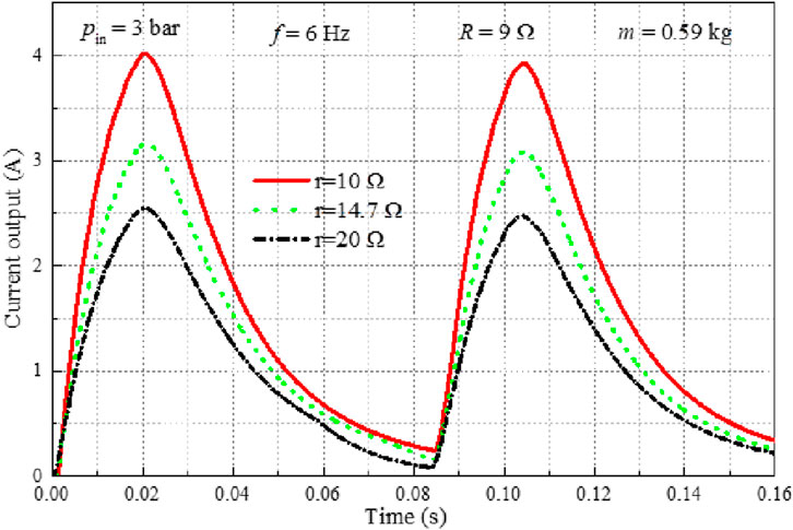 where Iout is the current output. The current output is rectified by a rectifier. When the intake pressure, operation frequency, external load resistance, mass of the FPA, and internal resistance of LG are set at 3 bar, 6 Hz, 9 Ω, 0.59 kg, and 10 Ω, respectively, the maximum current recorded is 4.0 A.