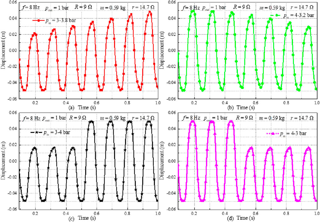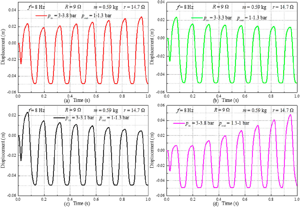Figure 12. Displacement varies with the changing of the intake pressure, (a) pin = 3-3.8 bar, (b) pin = 4-3.2 bar, (c) pin = 3-4 bar, (d) pin = 4-3 bar.