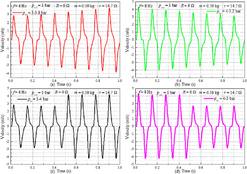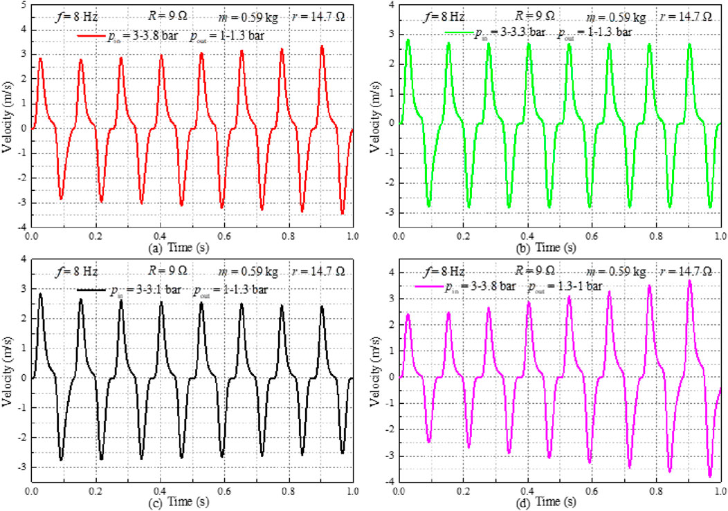 The influence of varying intake pressure and exhaust back pressure on voltage output is presented in Figure 25. As shown in Figure 25a, the peak voltage output exhibits an increasing trend when intake pressure rises from 3 bar to 3.8 bar while exhaust back pressure increases from 1 bar to 1.3 bar. Notably, the peak voltage output displays asymmetric fluctuations between high and low values. This phenomenon is attributed to the inconsistency between the magnitudes of the peak forward velocity and peak negative velocity. Minor fluctuations in peak output voltage are observed in Figure 25b when intake pressure and exhaust back pressure increase at identical rates. Conversely, Figure 25c demonstrates a decreasing trend in peak voltage output when the rate of increase in exhaust back pressure exceeds that of intake pressure. It is established that increasing intake pressure while reducing exhaust back pressure enhances voltage output. Under these conditions, Figure 25d reveals that the peak voltage output exhibits a predominantly linear trend over time.